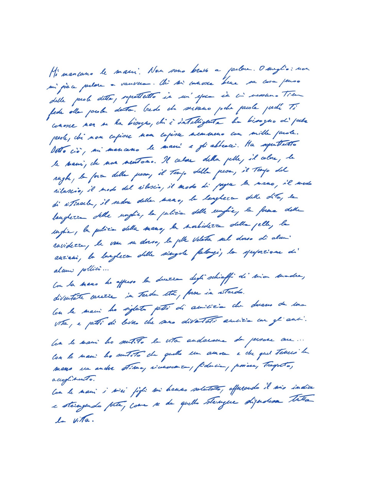 Non sono bravo a parlare. O meglio: non mi piace parlare a vanvera. Chi mi conosce bene sa cosa penso delle parole dette, soprattutto in cui epoca in ci nessuno tiene fede alla parola data. Credo che servano poche parole. Chi ti conosce non ne ha bisogno, chi è intelligente ha bisogno di poche parole, chi non capisce non capisce nemmeno con mille parole. Detto ciò, mi mancano le mani e gli abbracci. Soprattutto le mani, che non mentono. Il calore della pelle, il colore, le rughe, la forza della presa, il tempo della presa, il tempo del rilascio, il modo del rilascio, il modo di porgere la mano, il modo di ritirarla, il sudore della mano, la lunghezza delle dita, la lunghezza delle unghie, la pulizia delle unghie, la forma delle unghie, la pulizia della mano, la morbidezza della pelle, la ruvidezza, le vene su dorso, la pelle velata sul dorso di alcuni anziani, la lunghezza delle singole falangi, la sproporzione di alcuni pollici… Con la mano ho appreso la durezza degli schiaffi di mia madre, diventate carezze in tarda età, forse in ritardo. Con le mani ha siglato patti di amicizia che durano da una vita, e patti di lavoro che sono diventati amicizia con gli anni. Con le mani ho sentito la vita andarsene da persone care… Con le mani ho sentito che quello era amore e che quel tenersi la mano era anche stima, riconoscenza, fiducia, passione, trasporto, accoglimento. Con le mani i miei figli mi hanno salutato, afferrando il mio indice e stringendo forte, come se da quello stringere dipendesse tutta la vita.