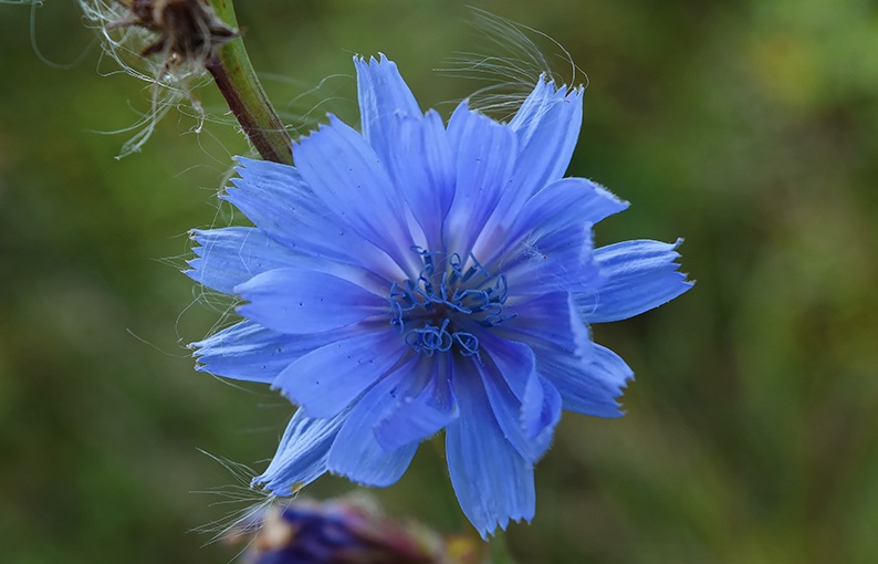 La cicoria fa dei bellissimi fiori, che sono i primi ad aprirsi la mattina e che tendono a richiudersi con il caldo più torrido. Anche se il mio colore preferito è il blu della cosiddetta “asprana” (in italiano Bluglossa Azzurra), la cicoria presenta molte nuance delicate di un blu azzurro violetto da cui anni e anni fa si tirava pure una tintura. Solo che quando “è andata in fiore” la cicoria è troppo dura e amara per essere mangiata.